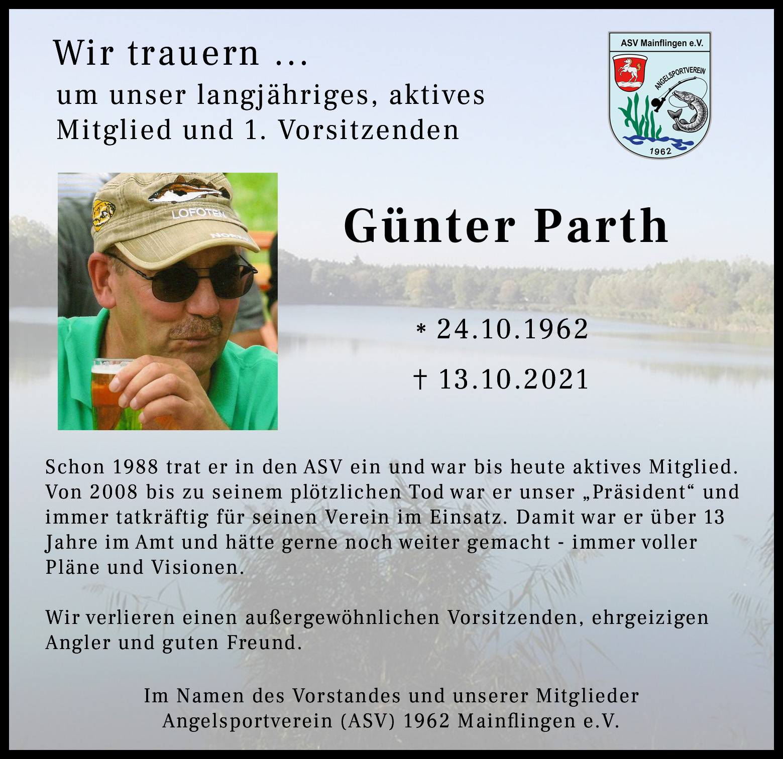 um unser langjähriges, aktives Mitglied und 1. Vorsitzenden Günter Parth, *24.10.1962 +13.10.2021.Schon 1988 trat er in den ASV ein und war bis heute aktives Mitglied. Von 2008 bis zu seinem plötzlichen Tod war er unser „Präsident“ und immer tatkräftig für seinen Verein im Einsatz. Damit war er über 13 Jahre im Amt und hätte auch gerne noch weitergemacht – immer voller Pläne & Visionen. [Nachruf]