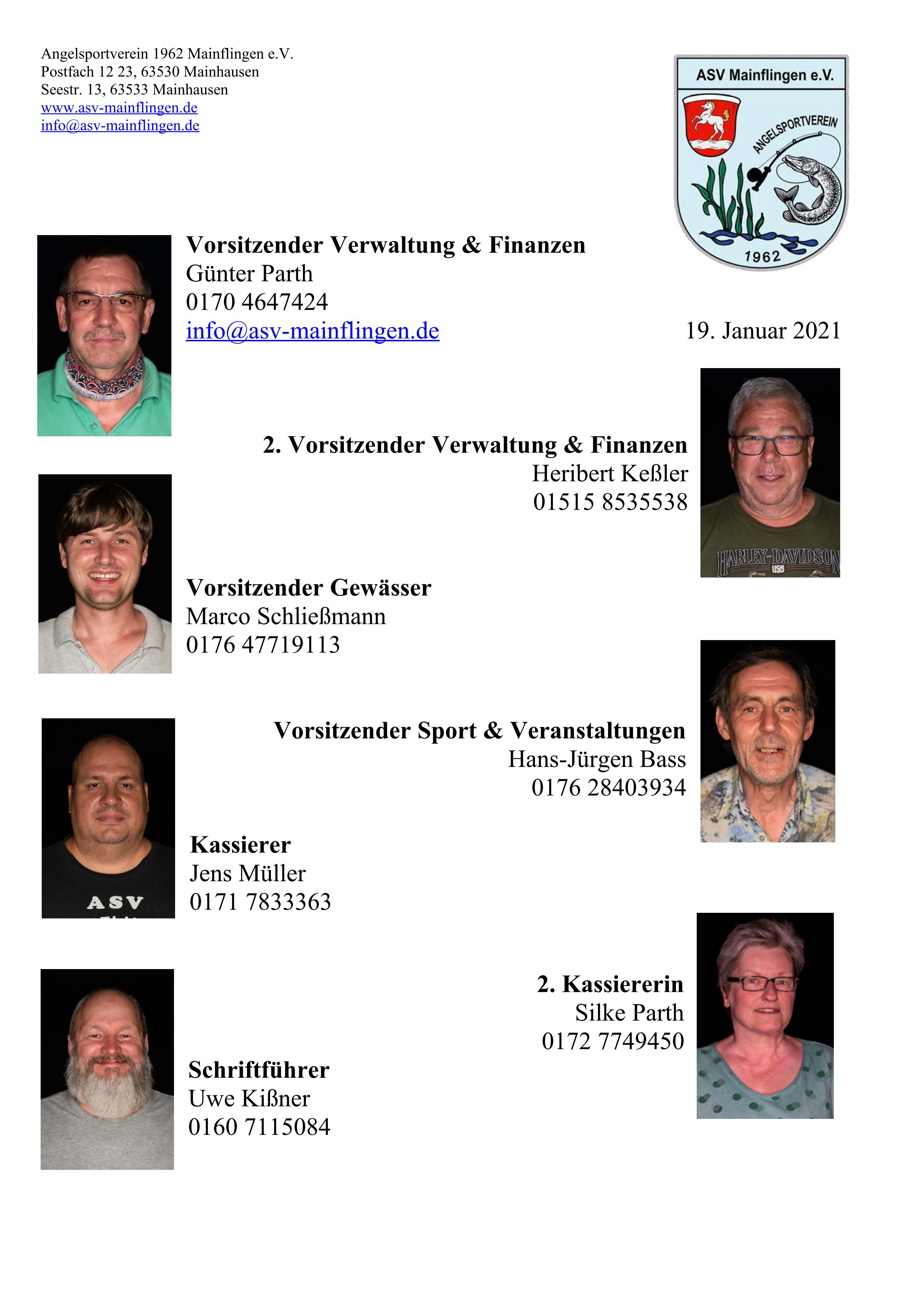 Günter Parth / Vorsitzender Verwaltung & Finanzen, Marco Schliessmann / Vorsitzender Gewässer, Hans-Jürgen Bass / Vorsitzender Sport & Veranstaltungen, Jens Müller / Kassierer, Moni Stolz / Schriftführerin, Christian Rosenberger / Sportwart, Thorsten Heß / 1. Gewässerwart, Uwe Kissner / Gewässerwart, Thomas Franzel / Gerätewart, Vincenzo Di Donna / Jugendwart, Reinhold Ehmig / Zuchtgewässerwart, Philipp Schnierle / Zuchtgewässerwart, Werner Siebenlist / Zuchtgewässerwart.